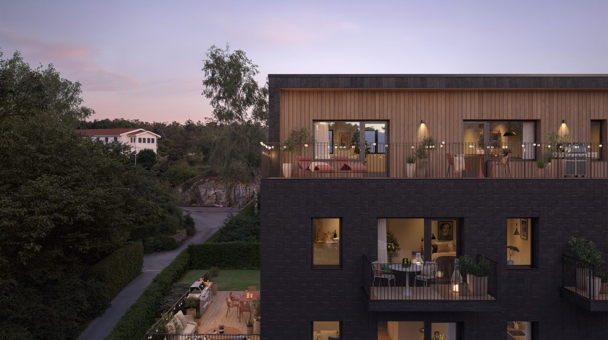 Invändigt präglas bostäderna av ljusa, luftiga rum med stora fönster och generösa takhöjder som släpper in naturen. Interiören är noggrant utformad med material som harmonierar med exteriören – ljusa träslag, natursten och genomtänkta detaljer som skapar en känsla av lugn och kvalitet. Planlösningarna främjar både umgänge och avskildhet, med öppna sällskapsytor och privata rum där varje kvadratmeter är optimerad för att ge ett funktionellt och trivsamt hem.